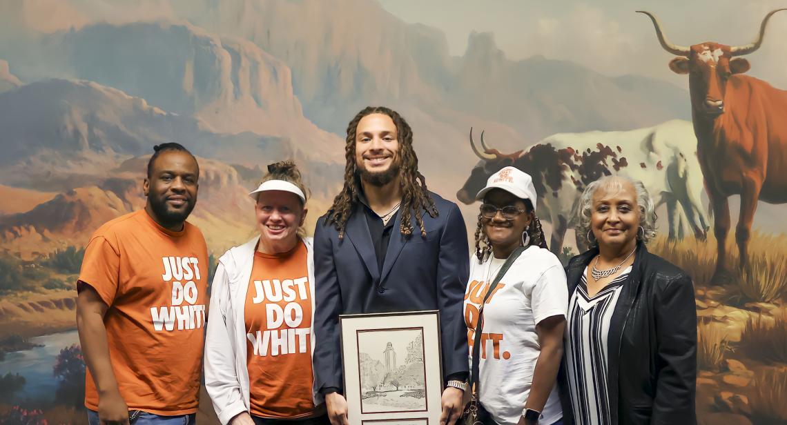 Jordan Whittington (center), recipient of the 2023-24 Mike Wacker Award, and family at the Texas Parents Ambassadors Council luncheon on Friday, March 22, 2024. Photo by Christy Zhuang